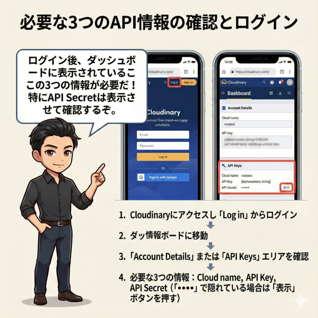 - Cloudinaryの「クラウド名」「API Key」「API Secret」