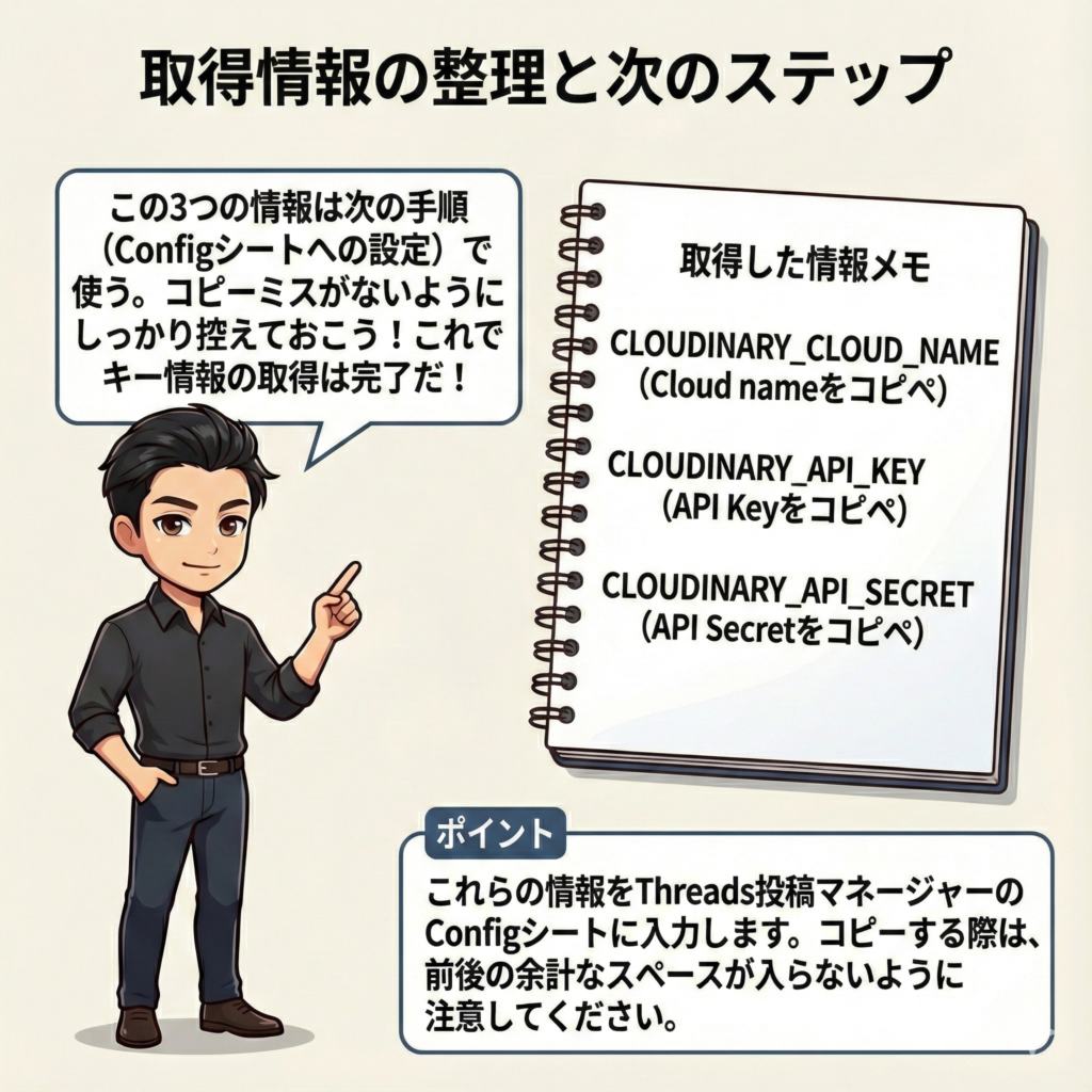 → コピペ推奨:CLOUDINARY_CLOUD_NAMECLOUDINARY_API_KEYCLOUDINARY_API_SECRET
