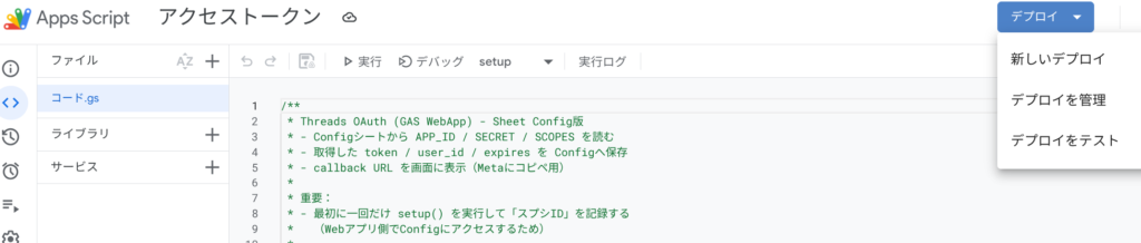 - 画面右上の 「デプロイ」 > 「新しいデプロイ」 をクリックします。