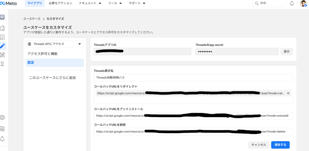 - Meta Developerで作ったアプリ(Threads APIが有効なもの)