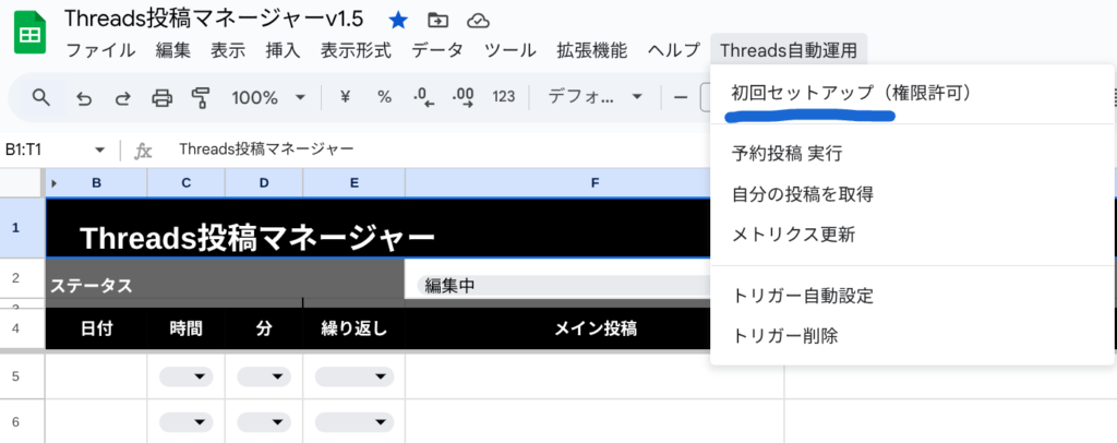 Threads投稿マネージャー用スプレッドシート を開きます。